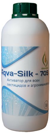 - сверхсильный смачиватель для наземных и авиационных обработок. Применяется на всех сельскохозяйственных и декоративных культурах открытого и защищенного грунта как добавка в рабочий раствор гербицидов, фунгицидов, инсектицидов, микроэлементов. С АКВА-СИЛК 705 рабочий раствор и действующее вещество пестицидов приникает глубоко в лист в течении 10-30 секунд, на проникновение не влияет опустошённость листа, восковой налёт, пыль и другие анатомо-морфологические факторы. Биологическая эффективность агрохимикатов резко усиливается, действие наступает гораздо быстрее. Агрохимикаты не смываются осадками и продолжают действовать. Свойства суперсмачивател АКВА-СИЛК 705, выявленные в ходе полевых испытаний: 1. Препятствует образованию конденсата в теплицах (5-15 дней после обработки). 2. Возможно уменьшение нормы вылива рабочего раствора (1,5-2 раза). С одной заправки опрыскивателя можно обрабатывать большую площадь. 3. Возможно, использовать пестициды и агрохимикаты с минимальной нормой